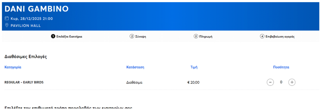 Επιλέγετε την ποσότητα εισιτηρίων που θέλετε και προσθέσετε τα στο καλάθι σας.