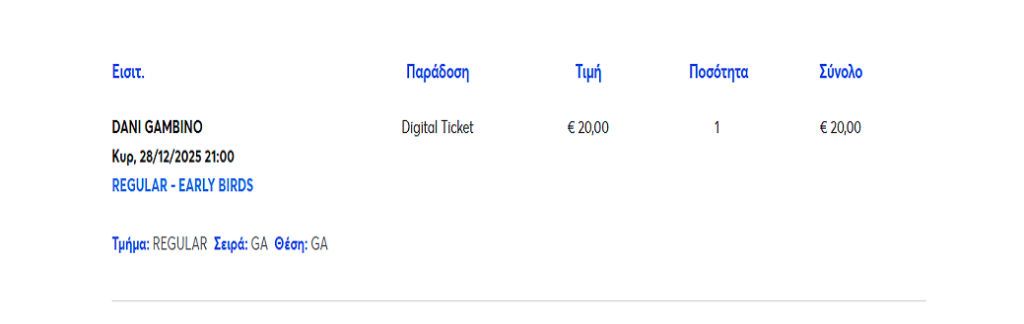 Όταν ολοκληρωθεί η παραγγελία σας θα λάβετε τα εισιτήρια σας ηλεκτρονικά στο email ή μπορείτε να τα κάνετε download στο wallet από τον λογαριασμό σας.