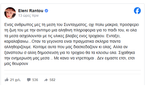 Εντάξει, καταλαβαίνω… Όταν τα γεγονότα είναι πραγματικά σκληρά, πάντα αλληθωρίζουμε. Κοιτάμε αυτά που μας διασκεδάζουν κιόλας. Αλλά αν ξαναπέσω σε άλλη δημοσίευση για το τροχαίο θα τα κλείσω όλα. Σιχάθηκα την ενημέρωσή μας… Με κάνει να ντρέπομαι. Δεν είμαστε έτσι, έτσι μας θεωρούν» γράφει χαρακτηριστικά η Ελένη Ράντου.