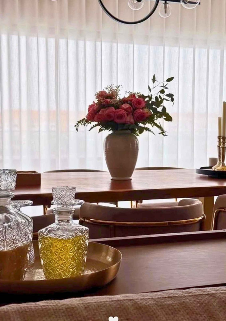 Κεντρικό σημείο αναφοράς είναι η επιβλητική τραπεζαρία με τις minimal καρέκλες, ενώ το λευκό βάζο με τα φρέσκα λουλούδια στην κορυφή προσθέτει αυτή την απαραίτητη νότα οικειότητας που κάνει ένα σπίτι να έχει “ψυχή”.