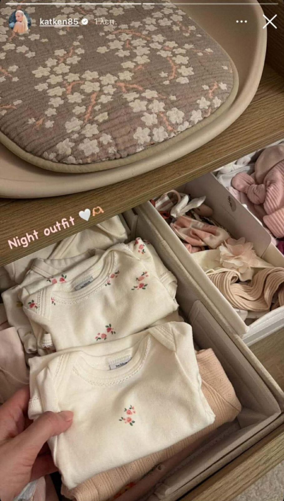 Η ίδια δημοσίευσε μια φωτογραφία από το συρτάρι της μικρής, αποκαλύπτοντας για πρώτη φορά τα ρουχαλάκια της νεογέννητης κόρης της, η οποία θα πάρει το όνομα Ξένια (Πολυξένη-Αλεξάνδρα). Η παρουσιάστρια συνόδευσε την ανάρτηση με τη λιτή φράση «Night outfit», κλέβοντας τις εντυπώσεις και προκαλώντας κύμα αγάπης από τους followers της.