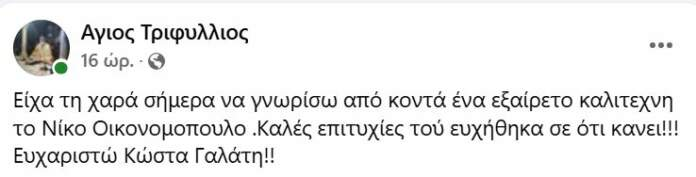 Την επίσκεψη του τραγουδιστή αποκάλυψε με ανάρτησή του στα κοινωνικά δίκτυα ο πάτερ της εκκλησίας, γράφοντας χαρακτηριστικά: «Είχα τη χαρά σήμερα να γνωρίσω από κοντά έναν εξαίρετο καλλιτέχνη, τον Νίκο Οικονομόπουλο. Καλές επιτυχίες τού ευχήθηκα σε ό,τι κάνει! Ευχαριστώ Κώστα Γαλάτη!».