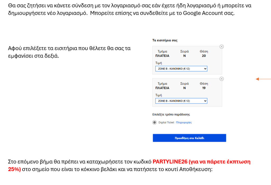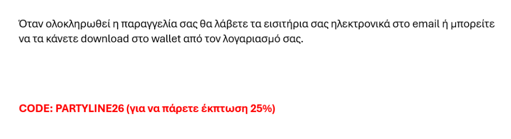 Εξασφαλίστε την έκπτωση σε όσα εισιτήρια επιθυμείτε, χρησιμοποιώντας τον κωδικό (Code): PARTYLINE26