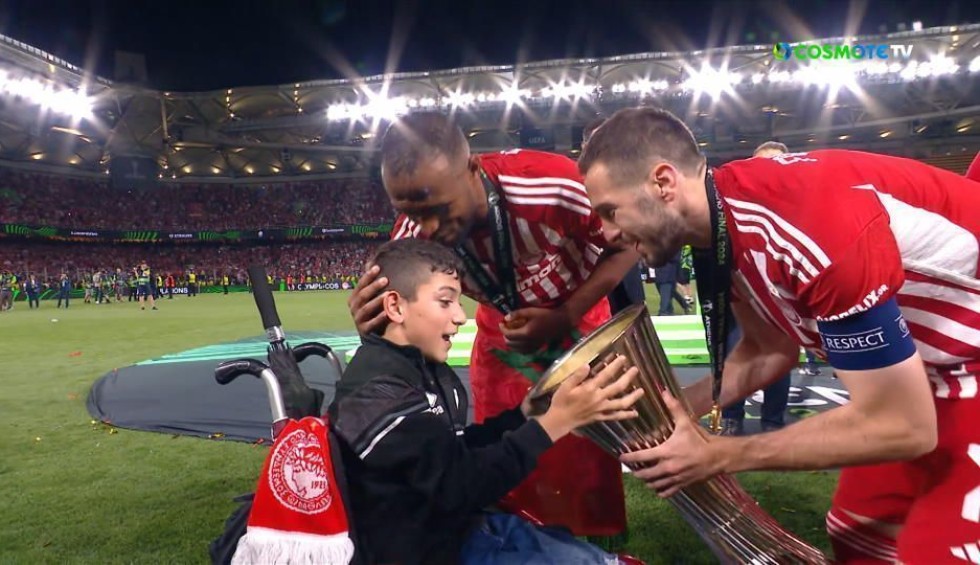 Ο μικρός Γιάννης, ο φίλαθλος και οπαδός του ΠΑΟΚ που έχει συγκινήσει με την παρουσία του, σηκώνει το τρόπαιο του Ολυμπιακού: