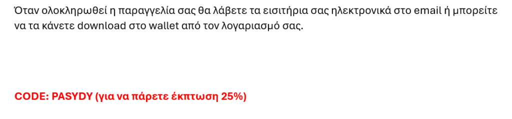 Για όσα εισιτήρια πάρετε σας προσφέρουμε: -25% έκπτωση με τον CODE: PASYDY.