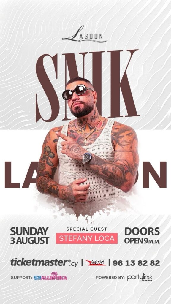 Ο SNIK, ο πιο αναγνωρίσιμος καλλιτέχνης της ελληνικής T-RAP σκηνής, έρχεται την Κυριακή 3 Αυγούστου στο LAGOON BEACH BAR στο Μακένζυ στην ΛΑΡΝΑΚΑ για μια βραδιά που δεν πρέπει να χάσεις! Μοναδική live εμφάνιση γεμάτη ένταση, τα μεγαλύτερά του hits και αληθινό καλοκαιρινό vibe για 50 λεπτά.