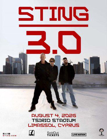 Σήμερα, ο καλλιτέχνης STING, νικητής 17 Grammy Awards, πρόσθεσε μια νέα συναυλία στο ιδιαίτερα αναγνωρισμένο “STING 3.0” World Tour, που παρουσιάζεται από τις Cherrytree Music Company και Live Nation, στην Κύπρο, την Τρίτη 4 Αυγούστου 2026, στο Tsirio Stadium, Λεμεσός, που προωθείται από την NNC Megaevents Productions, Cyprus.