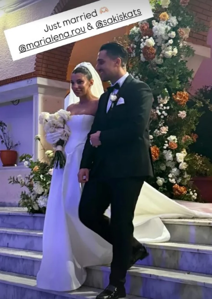Αναλυτικότερα, τα πρώτα στιγμιότυπα που κυκλοφόρησαν στα κοινωνικά δίκτυα δείχνουν τη Μαριαλένα Ρουμελιώτη με ένα κλασικό μακρύ νυφικό και τον Σάκη Κατσούλη να την υποδέχεται στην εκκλησία.