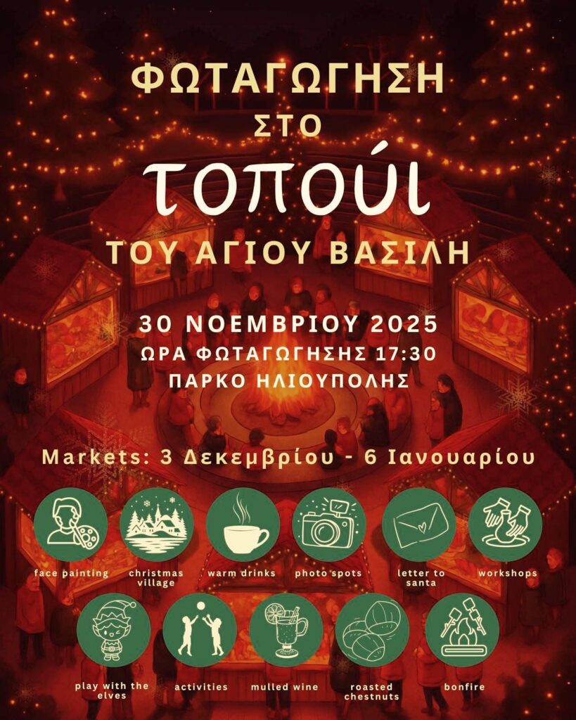 Το «Τοπούι» ανακοινώνει την επίσημη έναρξη της φετινής χριστουγεννιάτικης περιόδου με τη Μεγάλη Τελετή Φωταγώγησης, η οποία θα πραγματοποιηθεί την Κυριακή, 30 Νοεμβρίου 2025 και ώρα 17:30, στο Πάρκο Ηλιούπολης «Βασίλης Μιχαηλίδης».