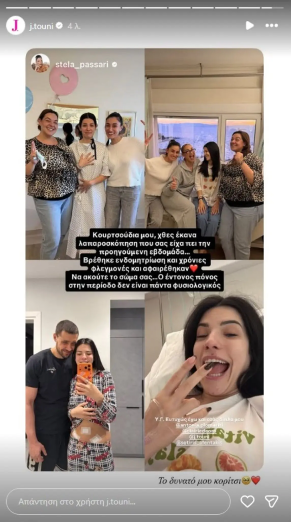 Όπως έγινε γνωστό μέσα από αναρτήσεις στα social media, η Στέλα Πασάρη προχώρησε σε λαπαροσκόπηση, έπειτα από έντονους πόνους που αντιμετώπιζε εδώ και καιρό. Κατά τη διάρκεια της επέμβασης, οι γιατροί εντόπισαν ενδομητρίωση και χρόνιες φλεγμονές, οι οποίες και αφαιρέθηκαν. Η ίδια, με ειλικρίνεια και θάρρος, θέλησε να μοιραστεί την εμπειρία της, στέλνοντας ένα ηχηρό μήνυμα προς όλες τις γυναίκες: να ακούν το σώμα τους και να μην αγνοούν τον έντονο πόνο, ειδικά όταν αυτός επαναλαμβάνεται.
